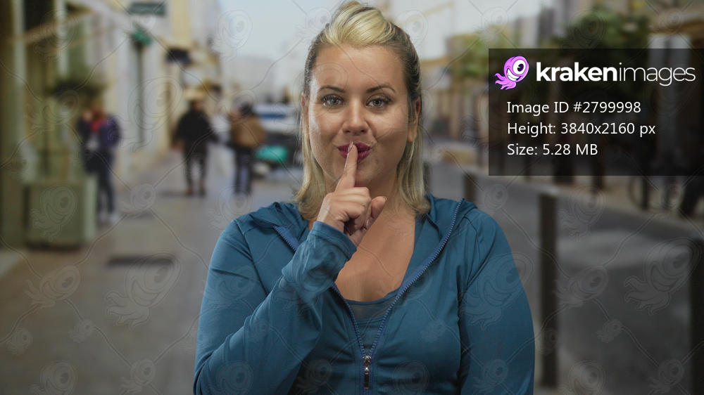Woman with blonde hair wearing a blue hoodie smiling on a busy street with blurred pedestrians; confidence.