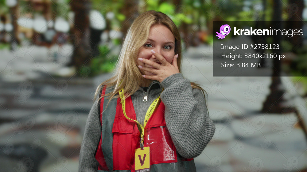 Woman with blonde hair wearing a volunteer badge and red vest in a park setting, looking happy and engaged outdoors during daytime.