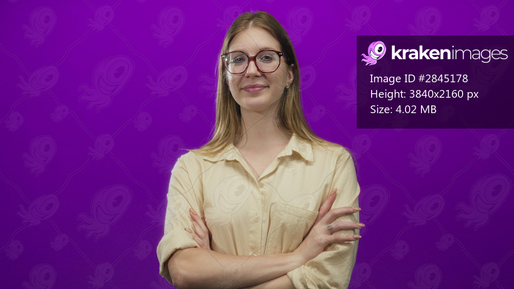 Woman with blonde hair wearing beige shirt and glasses crosses arms with slight smile in a purple studio; confidence.