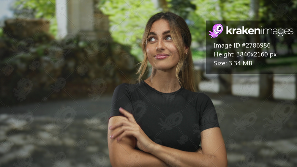 Woman blonde hair wearing black shirt with folded arms looking up amid green trees in park; confidence optimism.