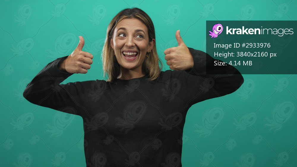 Woman with blonde hair wearing black sweater giving thumbs up and smiling in studio with teal backdrop; optimism approval.
