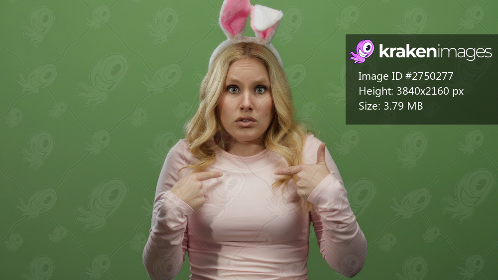 Woman with blonde hair wearing bunny ears and pink shirt gestures humorously against a vibrant green background, expressing surprise and playfulness.