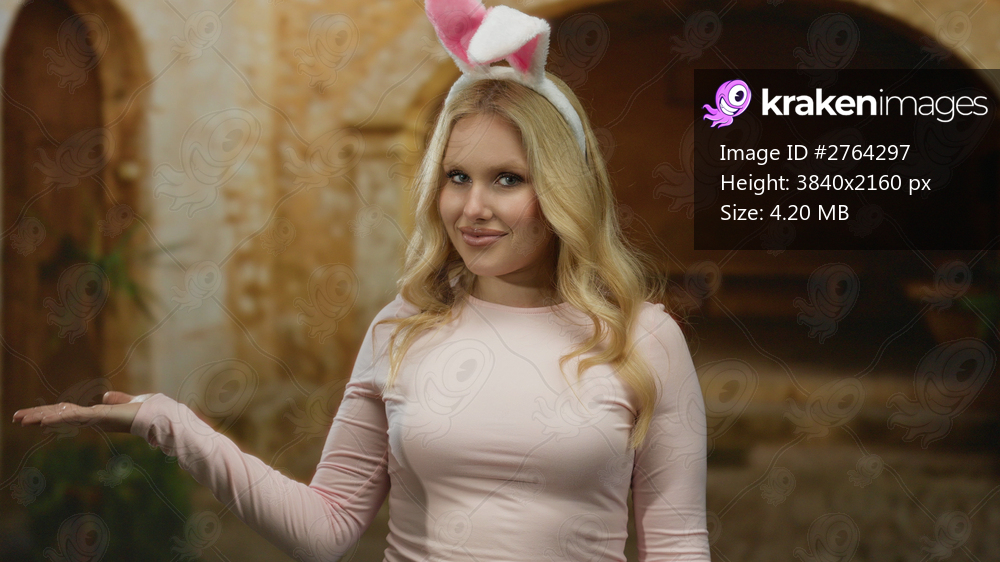 Woman with blonde hair wearing bunny ears and pink top humorously poses showing something on university campus with an ancient brick backdrop.