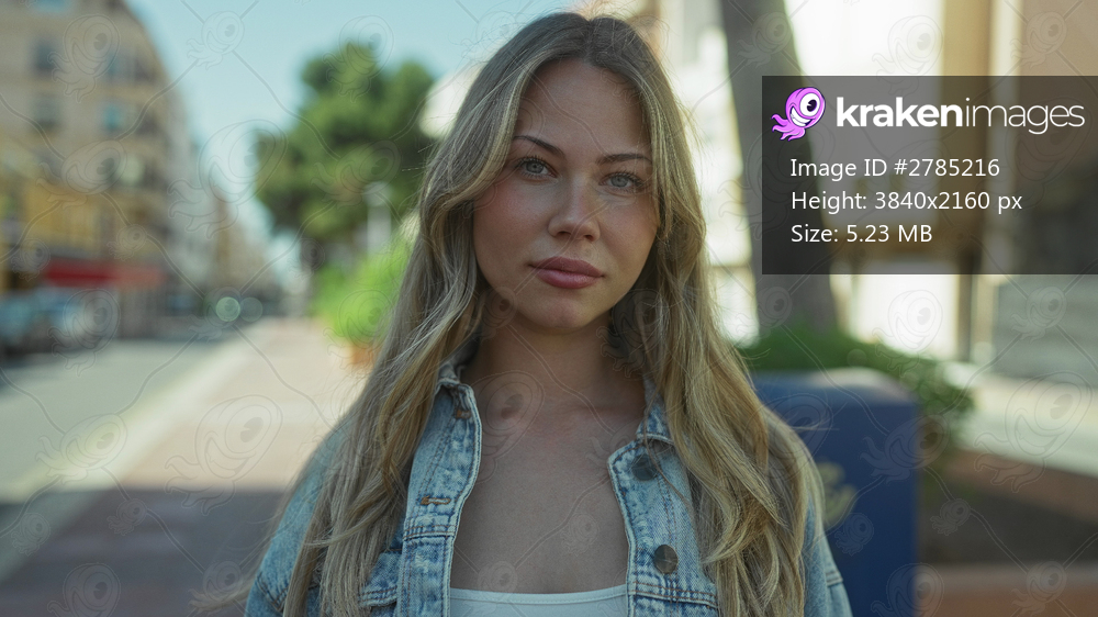 Woman with blonde hair wearing denim jacket smiles at camera on city street under bright sunlight; joy confidence optimism warmth.