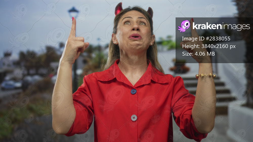 Woman with blonde hair wearing devil horns headband and red shirt points finger upward on street; playfulness.