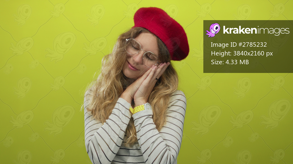 Woman with blonde hair wearing glasses and a beret and a striped top and a watch folds hands while sleeping in a studio with green backdrop.