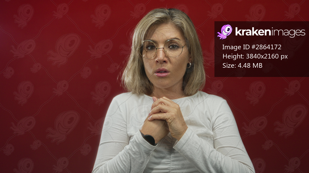 Woman with blonde hair wearing glasses and a white shirt with clasped hands in a red studio setting; anxiety stress worry concern.