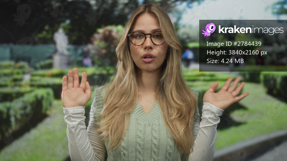 Woman with blonde hair wearing glasses raising both open palms in a green park with trimmed hedges under soft daylight; uncertainty doubt confusion hesitation. - Kraken Images
