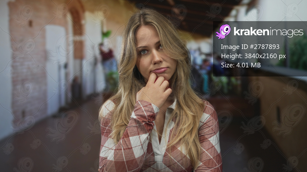 Woman with blonde hair wearing plaid shirt pressing hand to chin in veranda walkway; contemplation introspection doubt reflection.