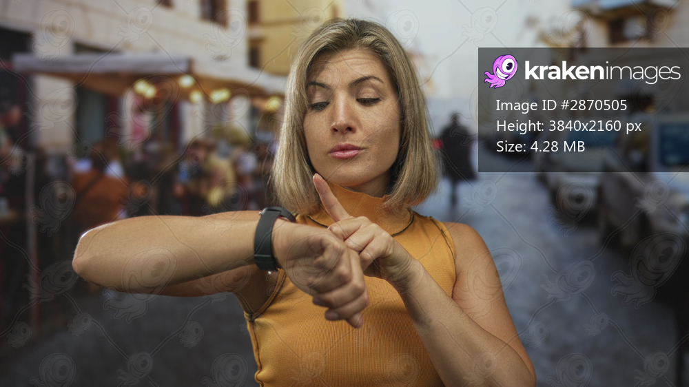 Woman with blonde hair wearing sleeveless orange top checking smartwatch on wrist in street cafe terrace; impatience.