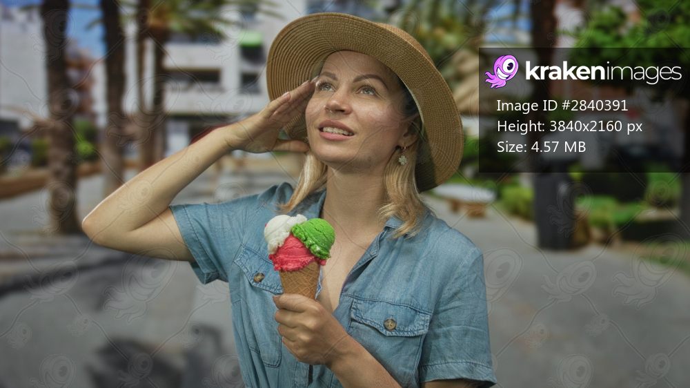 Woman with blonde hair wearing straw hat holding a triple scoop icecream cone shades eyes on a sunny street; joy.