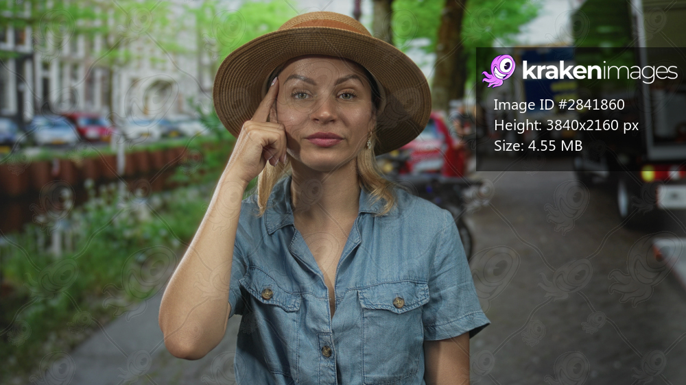 Woman with blonde hair wearing straw hat pointing finger to head in busy city street; thoughtful introspection.
