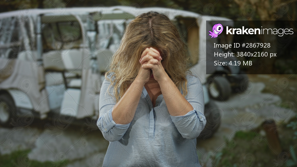 Woman blonde with hands clasped in prayer, eyes closed, standing near parked golf cart in forest; hope reflection.