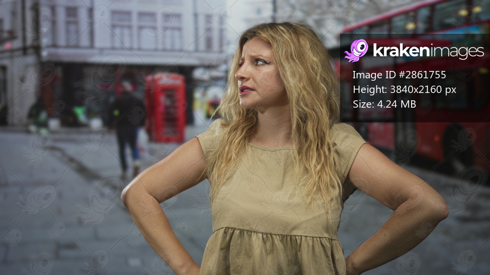 Woman, blonde, hands on hips, bare arms on a city street beside a red bus and telephone booth; annoyance urban commute.