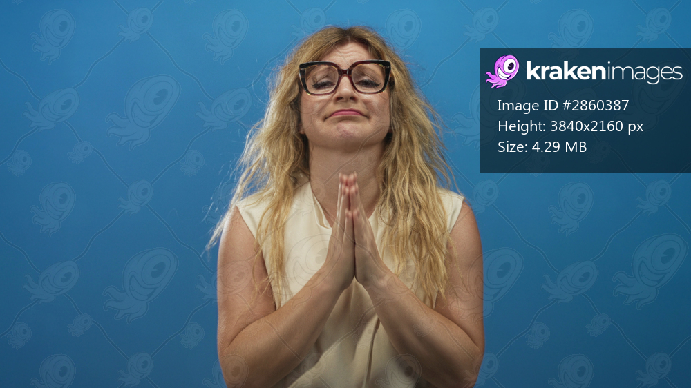 Woman, blonde, with hands pressed together in prayer pose in studio against a solid blue backdrop; hopeful.