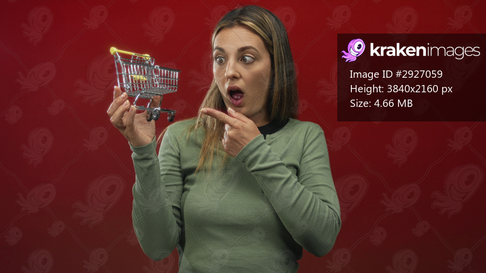 Woman blonde holds a miniature shopping cart in one hand and covers mouth with the other hand in red studio; surprise shopping concern.