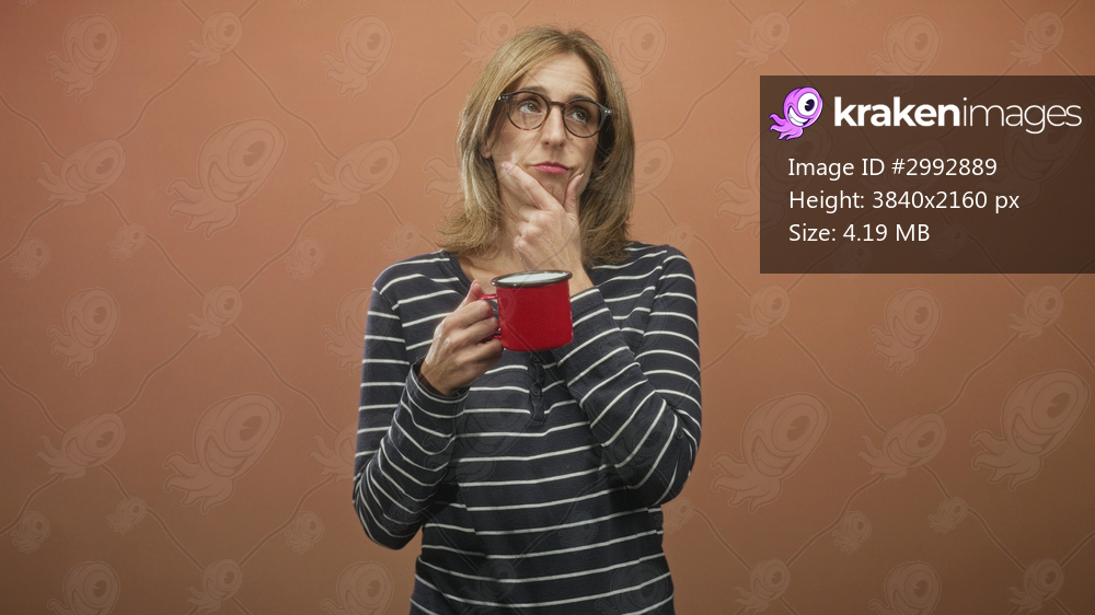 Woman blonde holds red mug while touching chin in studio with soft brown backdrop, closed eyes and striped sweater; thoughtful reflection.
