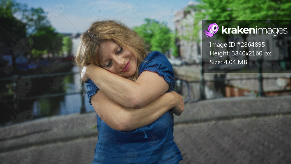 Woman blonde hugging arms in blue dress on street by amsterdam canal bridge with closed eyes and head tilted back; contentment.