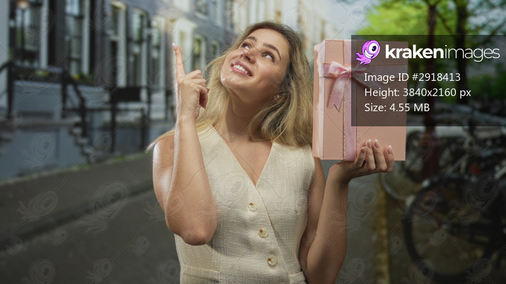 Woman blonde in cream dress holds pink gift box with bow and points finger upward on cobblestone street; joy celebration giving.