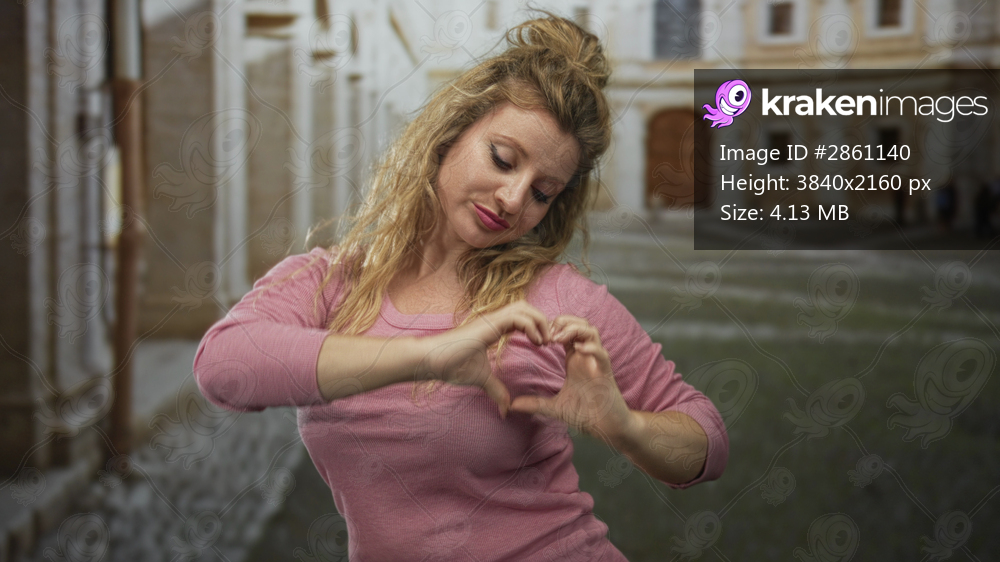Woman blonde making heart shape with hands on cobblestone street in old town near stone building and archway; love.