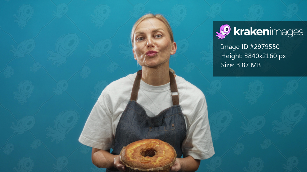 Woman blonde middle age wearing apron puckering lips while holding sponge cake with both hands in studio; homemade baking pride.