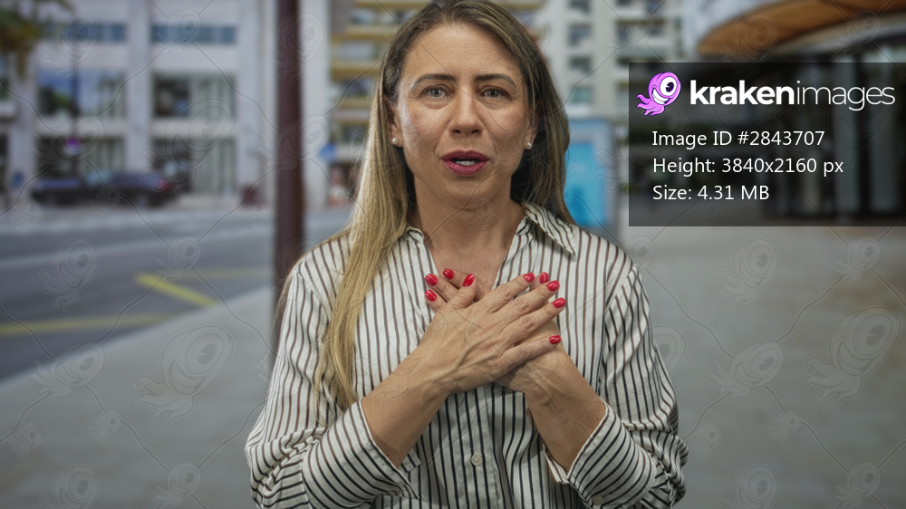 Woman blonde middle aged wearing striped shirt clutches chest for heartattack on grey street; pain fatigue.