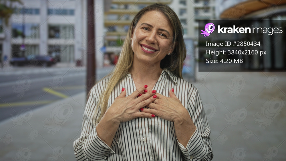 Woman blonde middle aged wearing striped shirt clutches chest for heartattack on grey street; pain fatigue.