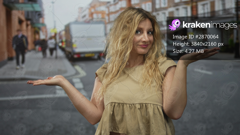 Woman blonde palms up shrug on busy city street showing open hands and casual smile while facing camera; curiosity doubt.