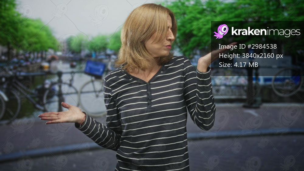 Woman blonde palms up shrugging beside parked bicycles and a canal railing on a street, hands open in a puzzled gesture; confusion.