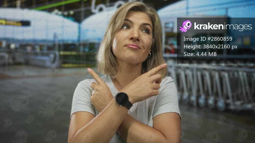 Woman blonde points fingers to both sides in busy airport terminal near luggage carts and trolleys while crossing arms in front; indecision travel choice. - Kraken Images