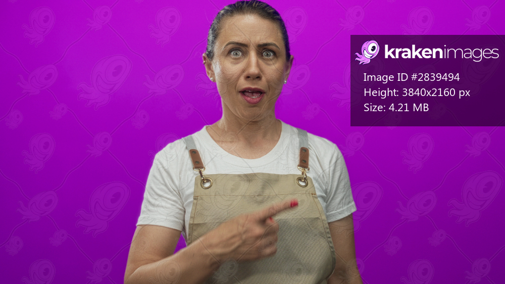 Woman with blonde ponytail wearing white t-shirt and beige overalls pointing finger to side in studio; surprise curiosity intrigue.
