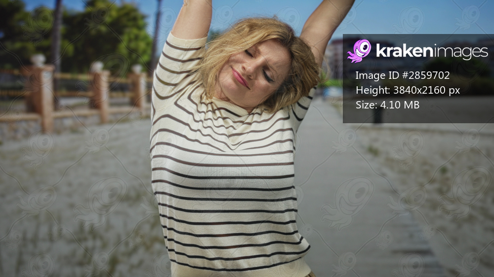 Woman blonde pressing hands to cheek in sleep gesture on street boardwalk near buildings, striped shirt, eyes closed and smiling; serenity.