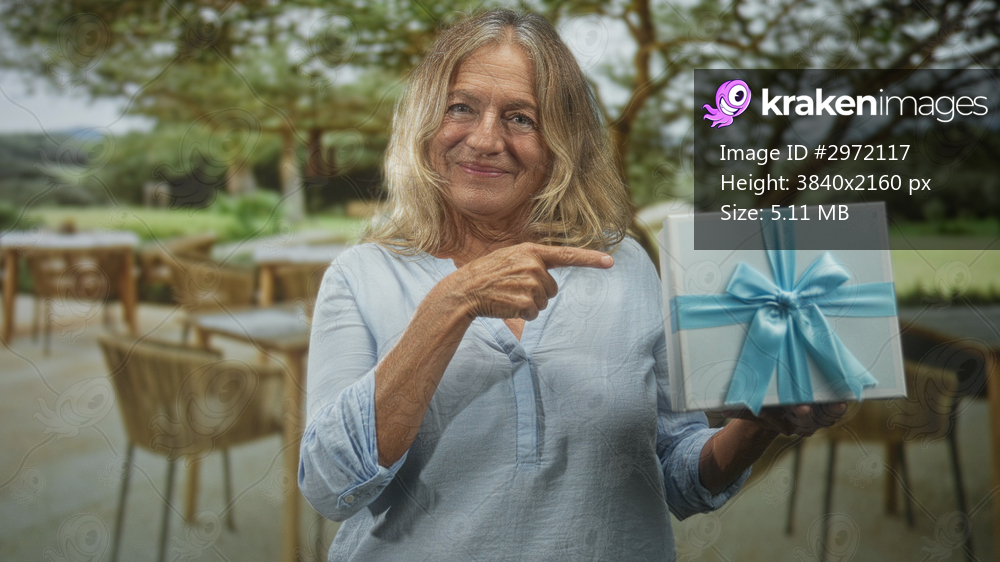 Woman, blonde senior, holding wrapped gift box with blue ribbon and pointing finger with hand in forest; celebration joy giving.