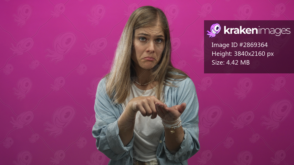 Woman blonde shows open palm and beckons with fingers in studio with magenta backdrop asking for money; pleading need.