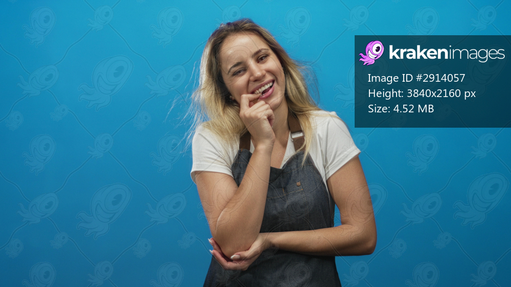 Woman blonde smiling with hand near mouth and folded arm, wearing denim apron and white tee in studio with bright blue backdrop; playful charm.