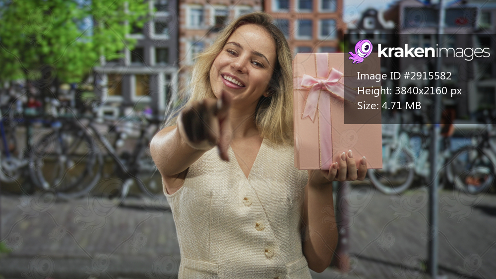 Woman blonde smiling points finger to camera holding pink gift box near canal on amsterdam street; joyful invitation.