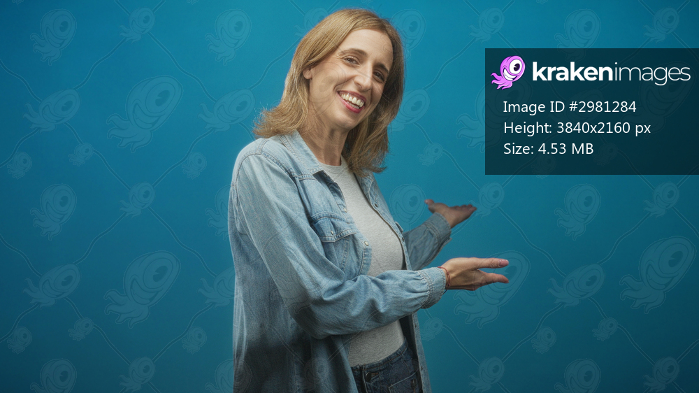 Woman blonde smiling and presenting open hands toward camera wearing denim jacket in studio; friendly invitation.