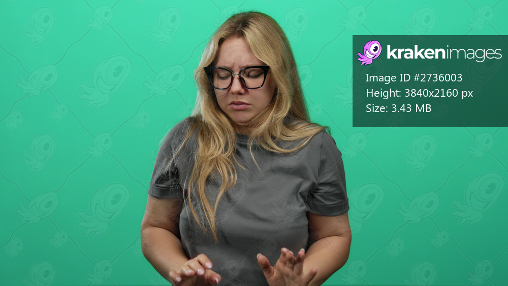 Woman blonde standing against green background expresses emotions with her hands, wearing glasses and gray shirt, giving a thoughtful and introspective expression. - Kraken Images