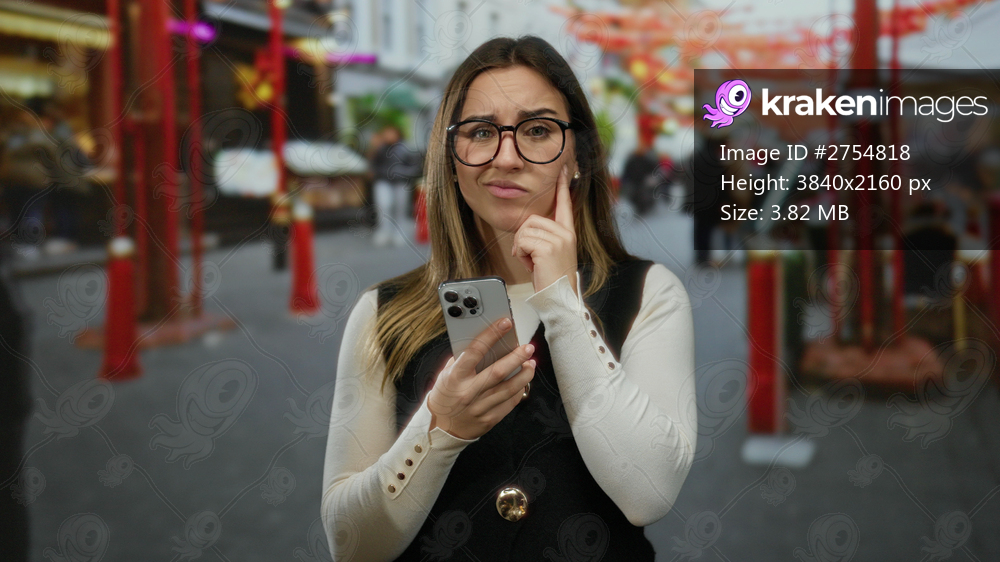 Woman, blonde, standing on busy street crammed with curious onlookers, engrossed in smartphone, contemplating, vibrant outdoor scene.