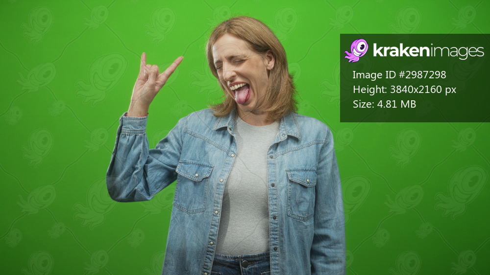Woman blonde sticking out tongue and flashing rock hand sign while wearing denim jacket and gray tee in green screen studio; playful defiance.