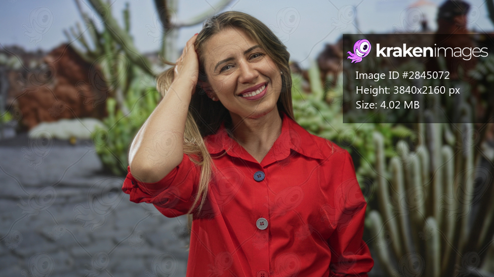 Woman blonde touching neck and hair with hand as she smiles softly under green trees in forest; serenity.