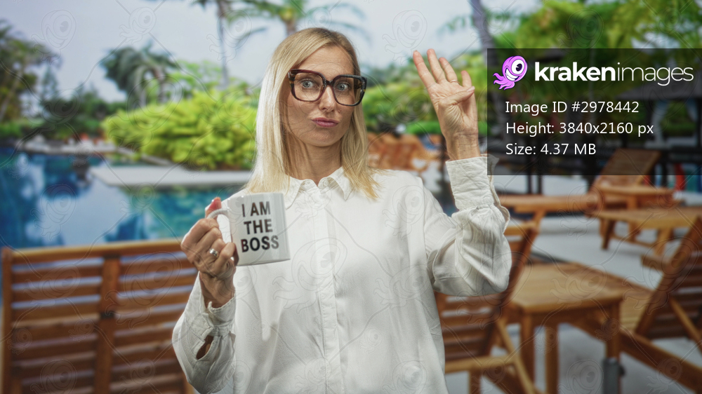 Woman blonde wearing glasses, holding a mug that reads i am the boss, right hand raised in a casual wave gesture in studio; confidence leadership.