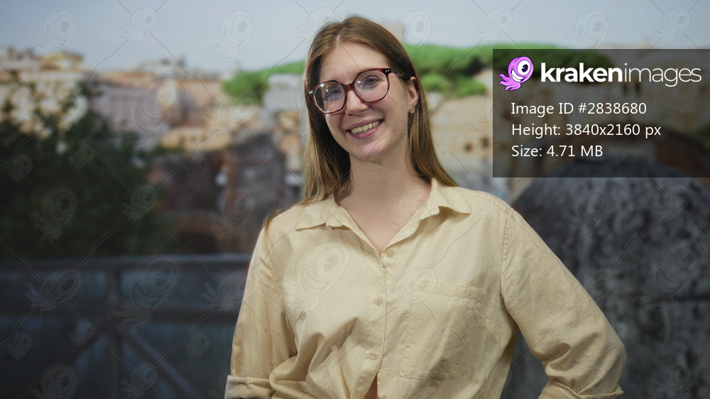 Woman blonde wearing glasses smiles and waves hand at ancient roman stone ruins building outdoors; happy discovery.