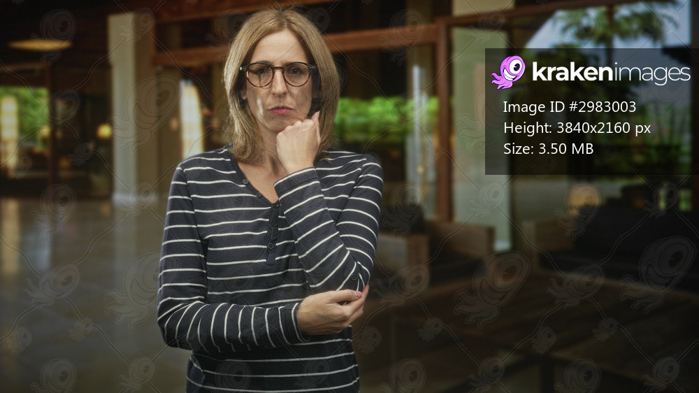 Woman blonde wearing glasses and striped sweater, chin on hand with arm crossed in building lobby with seating and palm trees visible; thoughtful reflection. - Kraken Images