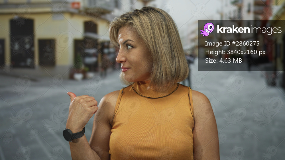 Woman blonde wearing orange sleeveless top with finger to lips for silence on a cobbled street with blurred shops and people; quiet secrecy.