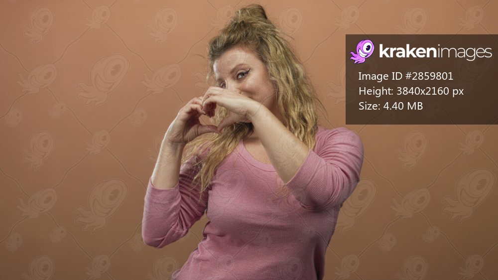 Woman blonde wearing pink sweater and tousled hair forms heart with hands in studio against peach backdrop while smiling and looking at camera; affection connection warmth community. - Kraken Images