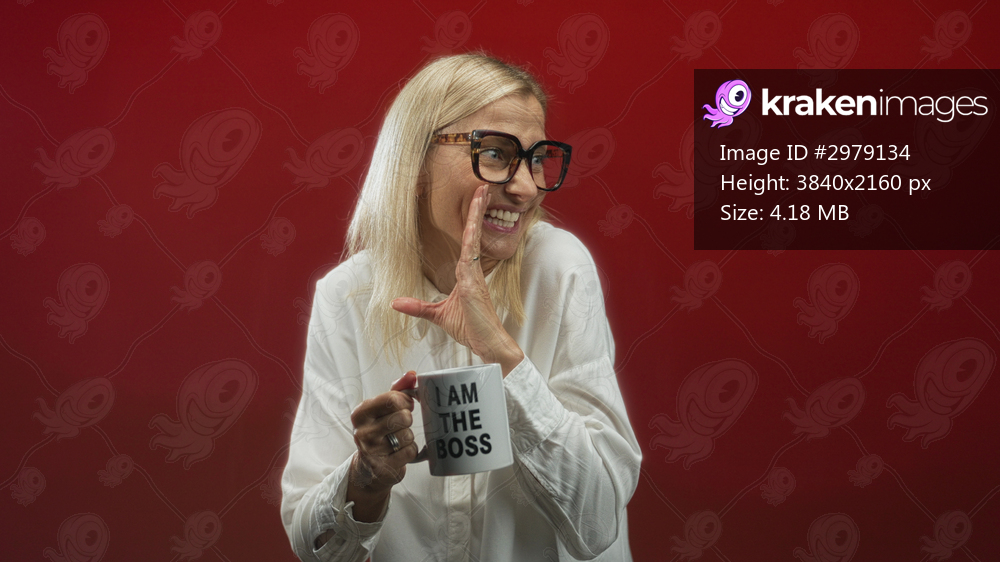 Woman, blonde wearing white blouse, holding mug that reads i am the boss, cupping hand to mouth and smiling in a studio with red backdrop; confidence.