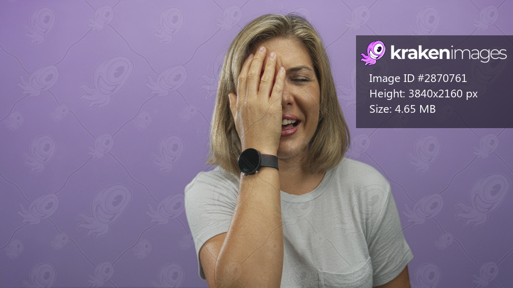 Woman blonde young covers one eye with hand wearing a smartwatch and white tee in studio with purple wall; fatigue.