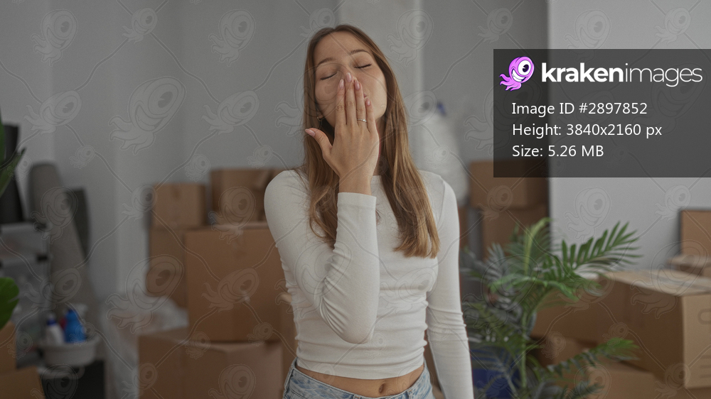 Woman blowing a kiss amid packed moving boxes in a new building interior, smiling and gesturing with hand near mouth; joy fresh start.