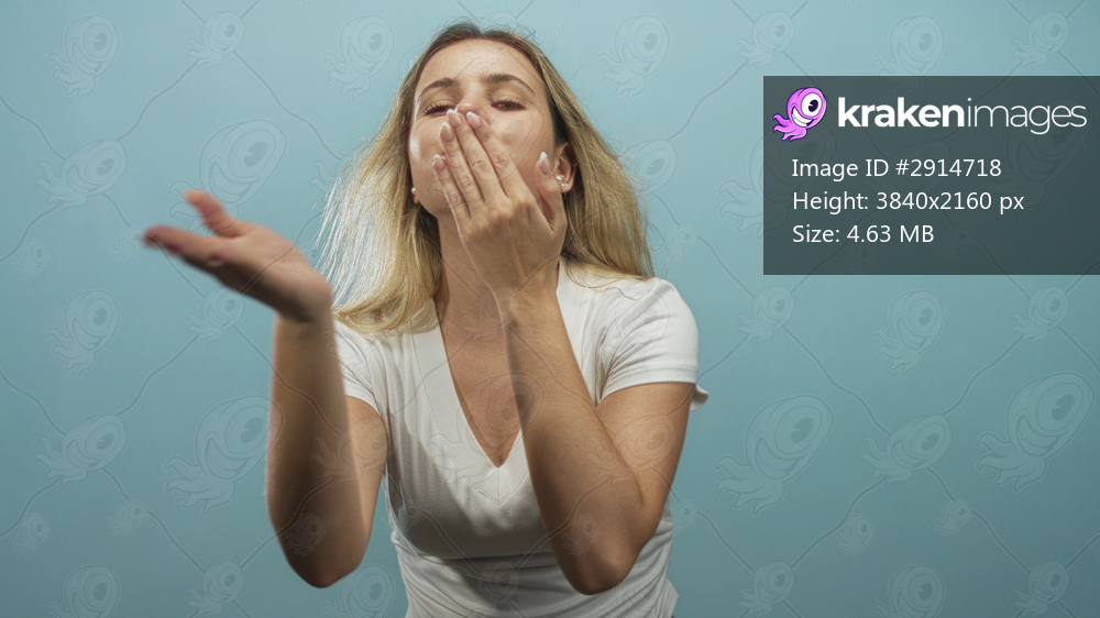 Woman blowing a kiss with both hands toward camera in light blue studio, white v neck top and long blonde hair visible; greeting gesture affection.